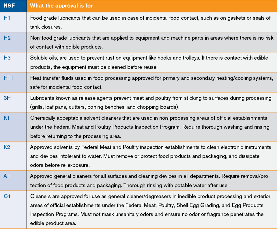 To ensure proper use of food grade lubricants, they are classified by NSF International: